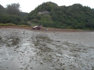 The Switchbacks are not for the light-hearted. they are seriously steep with turns that are sharply banked. It would be quite easy to roll a vehicle, especially if the road is muddy after heavy rains, as the clay surface would be very slick. We were able to reach the ocean easily with a 13.3 foot high tide.